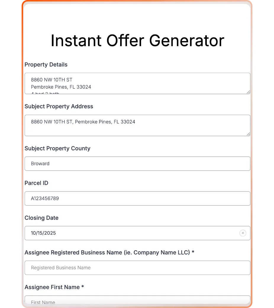 Fill one form on the property page and we auto-merge your Assignment of Contract, then route for e-signature. Move from interest to signed offer in minutes, not days.